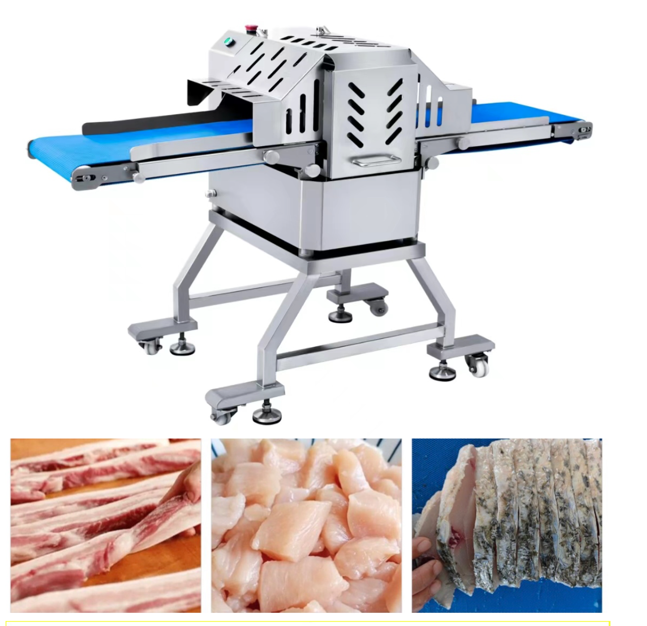 产品简介:产品名称:肉类开条切块机 禽类切条切块机 功能:主要用于鲜肉(牛羊肉 猪肉 鸡胸肉)一遍开条,切二遍切块,鱼类切块切段,禽类(鸡鸭鹅)开条切块。风干肉 腊肉切片 开条切丁块等入料出料:采用输送带进料 出料,过料高度 55 80 120mm不同刀