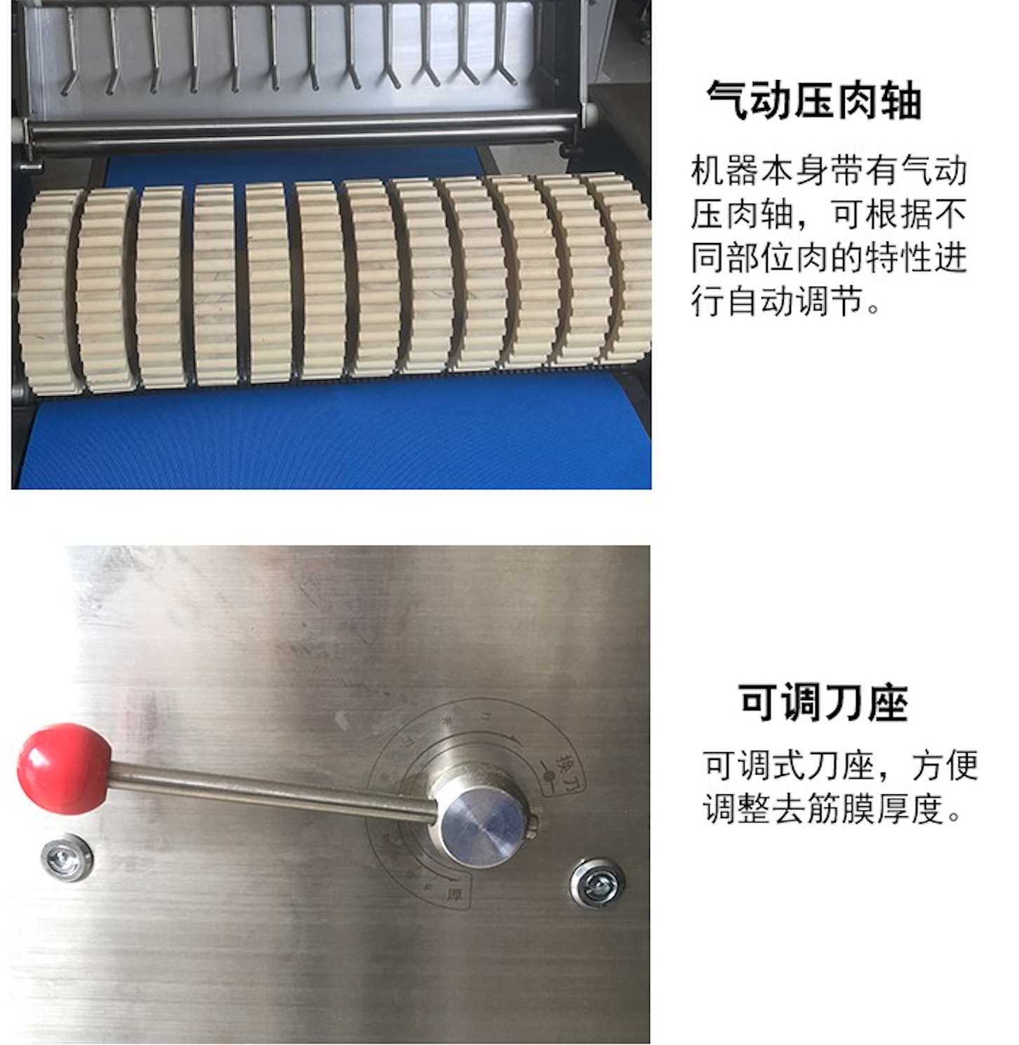 2.机器本身带有气动压肉轴,可根据不同部位肉的特性进行自动调节。